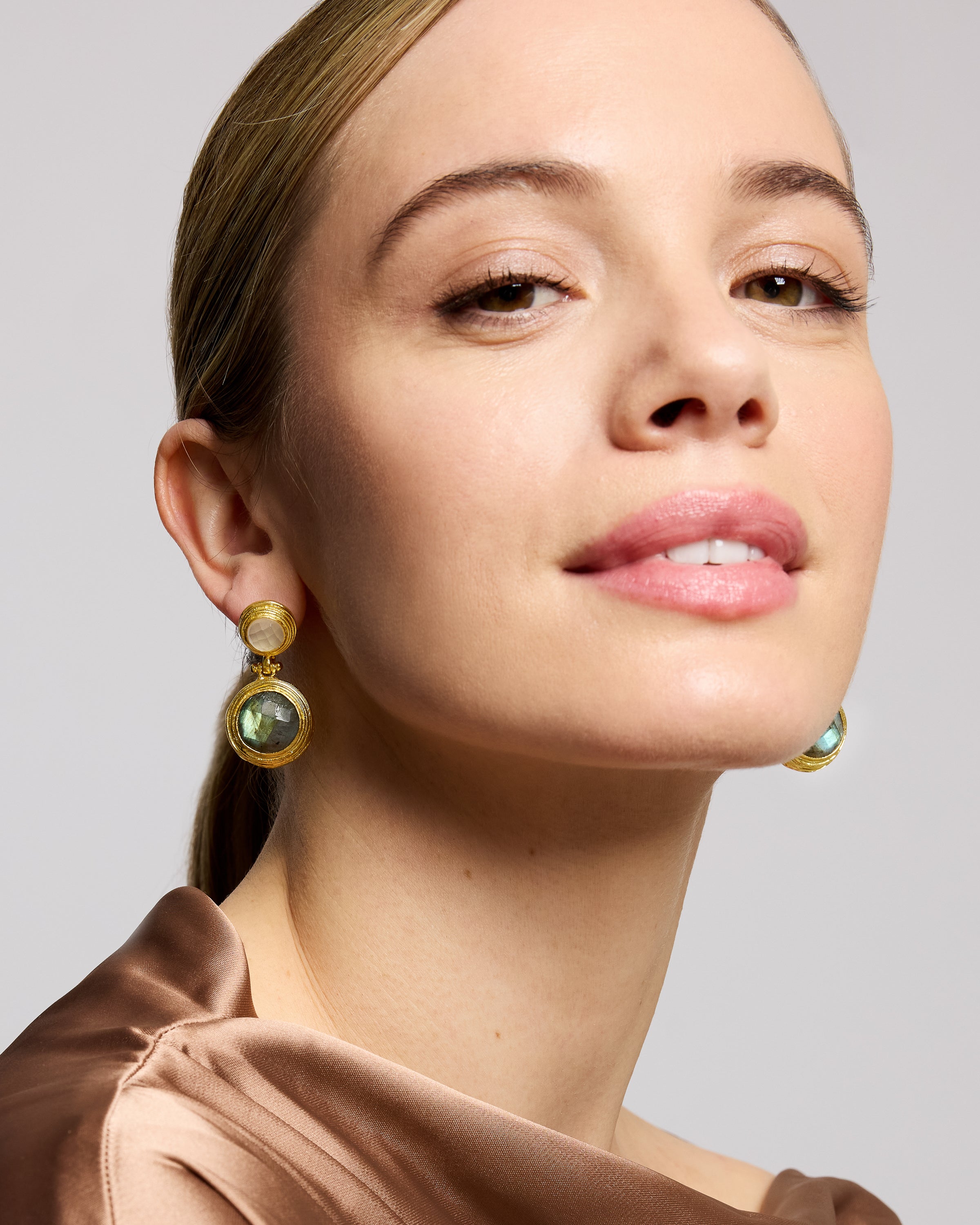Woven textured gold moulds and captivating gemstone combination make these gold drop earrings a unique piece to add to your collection. Hand-set with white chalcedony and labradorite gemstone, these stud earrings will bring a touch of everyday elegance to any look.