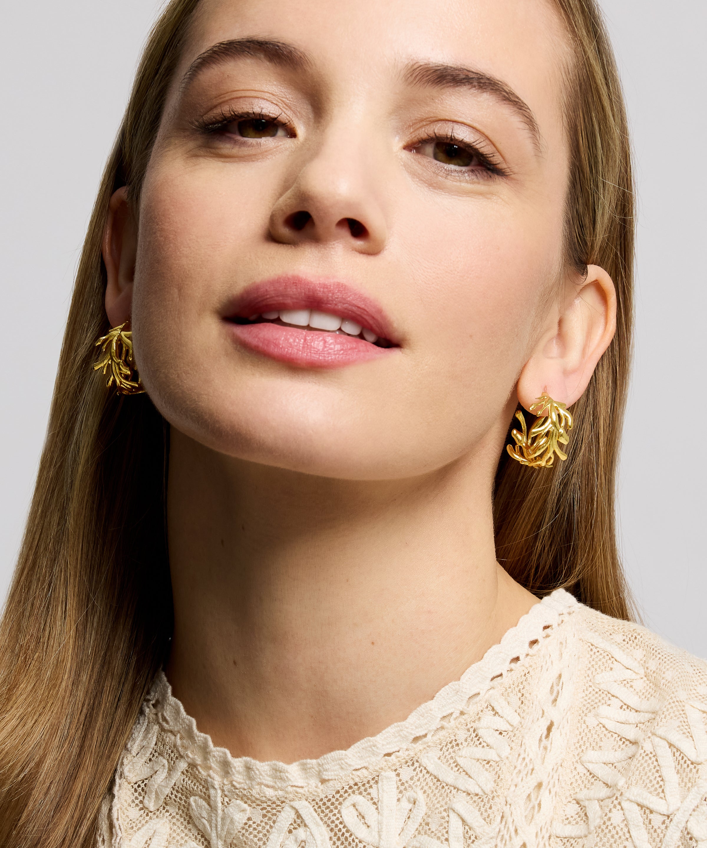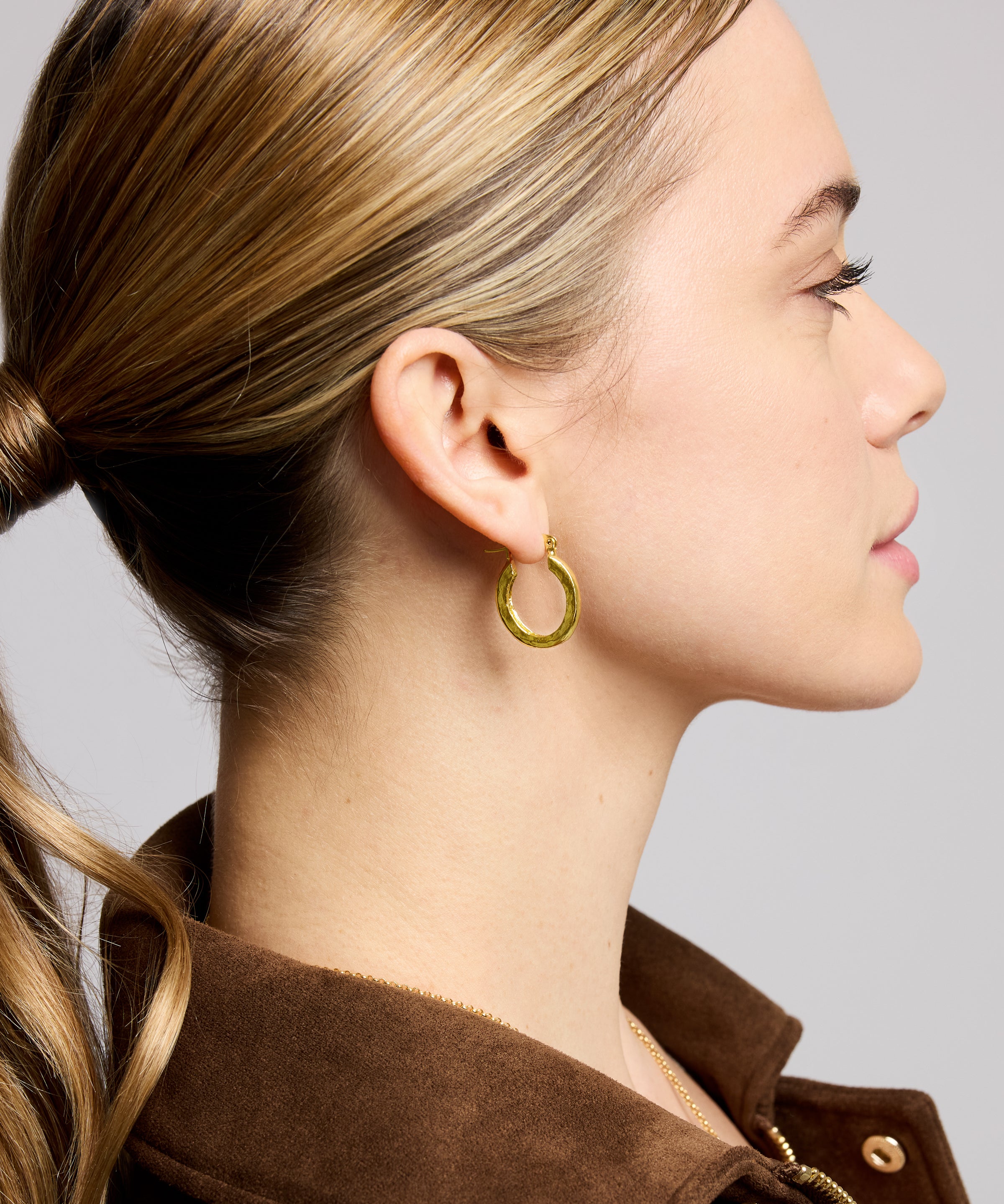 There is such a variety available in this stunning collection of hoop earrings, with many of the designs incorporating different textures from hammered to engraved gold. There are a number of pieces that draw influence from antique style, with ornamental sun rays and intricate patterns included. They come in both standard stud fitting and pull-through depending on the design, so you can choose what works best for you. Why not style your hoop earrings in a set of multiples, varying in size, so that you can stack them if you have a number of piercings in both ears.