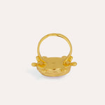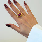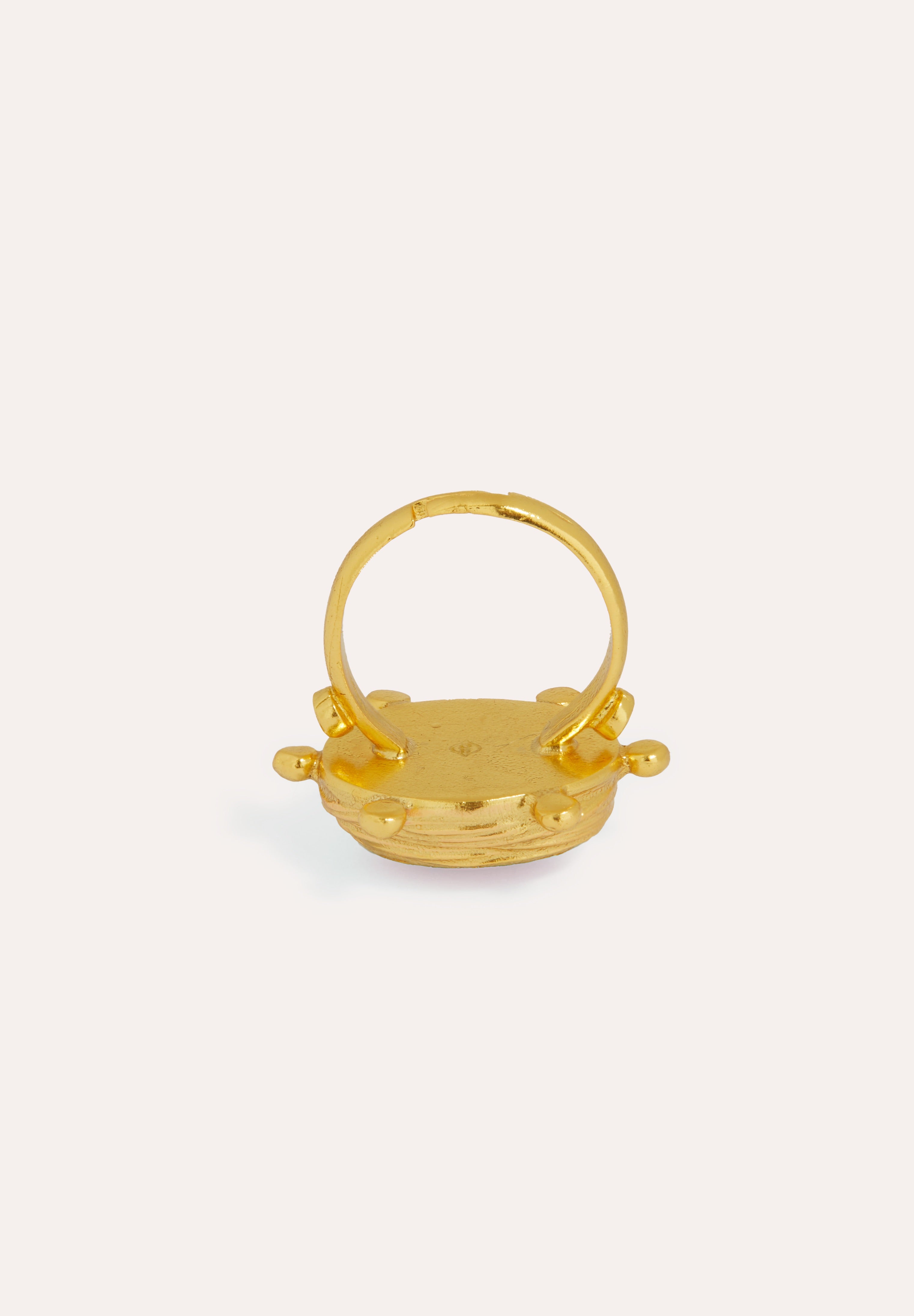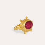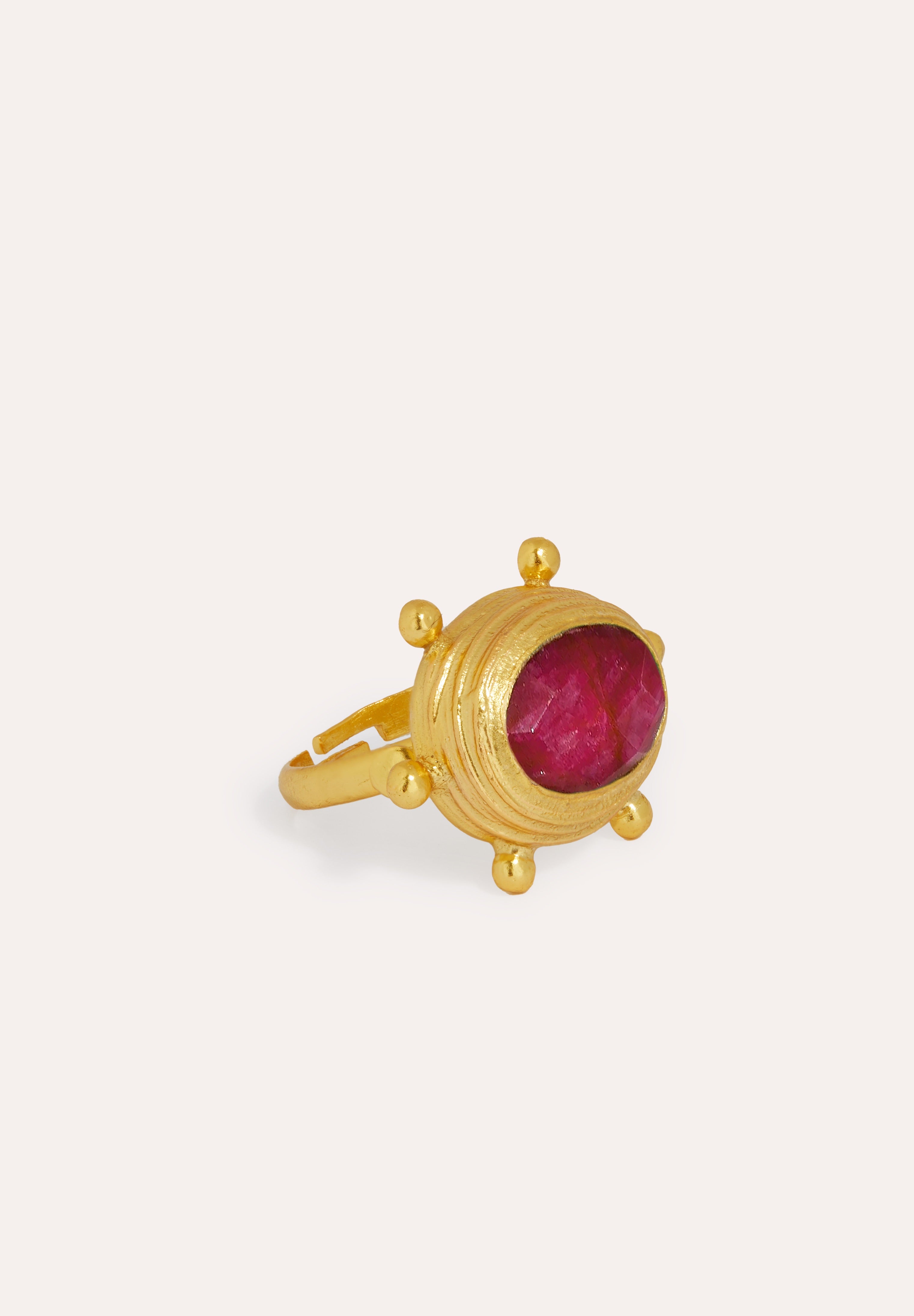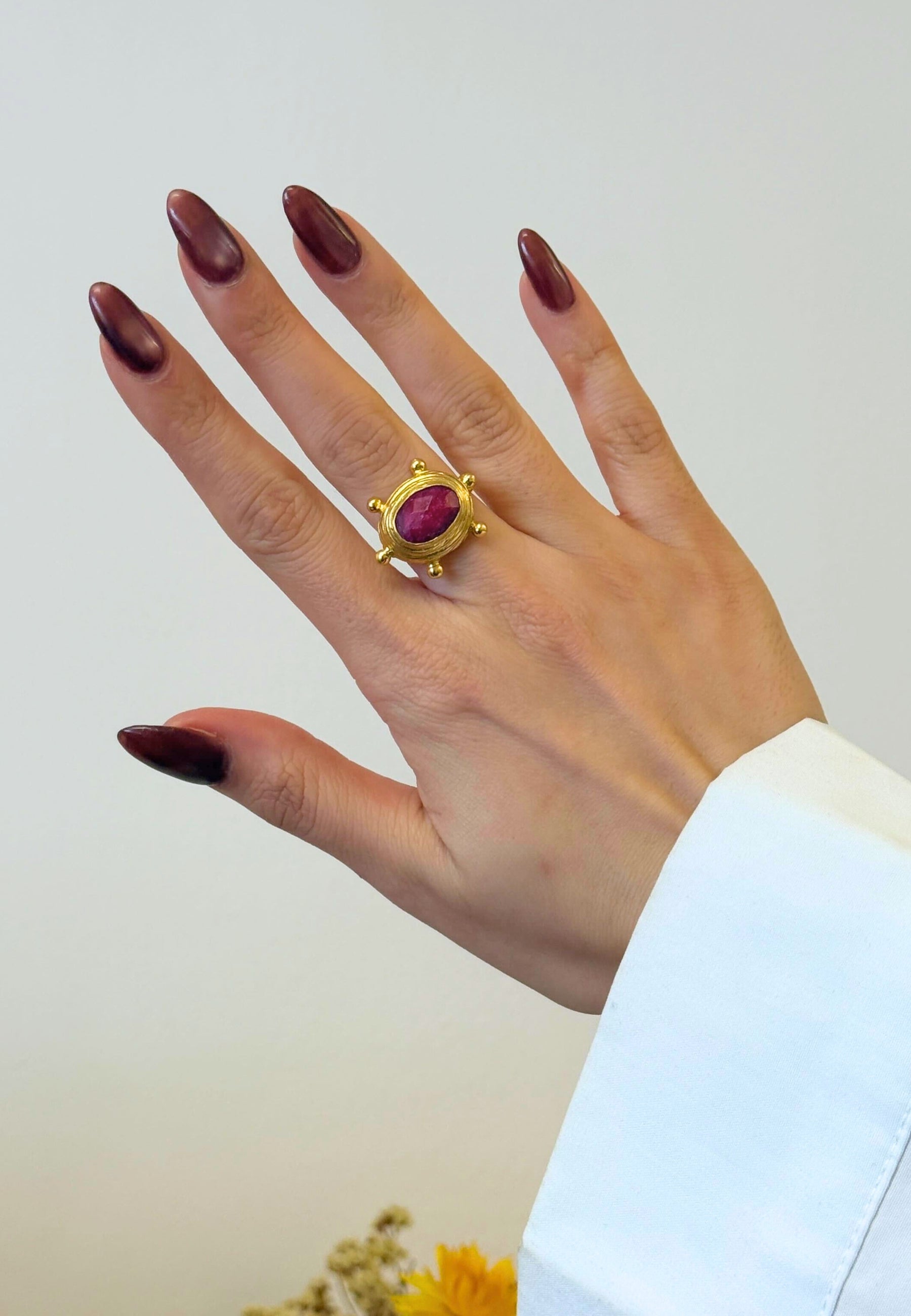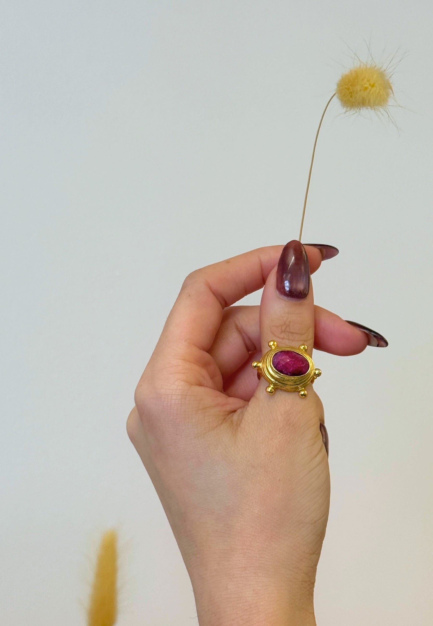 This handmade ring has been set with a Ruby gemstone. Intricate woven moulds and granulation details add charm and uniqueness to this ring. Adjustabe for the perfect fit, simply apply pressure to increase or decrease band size.