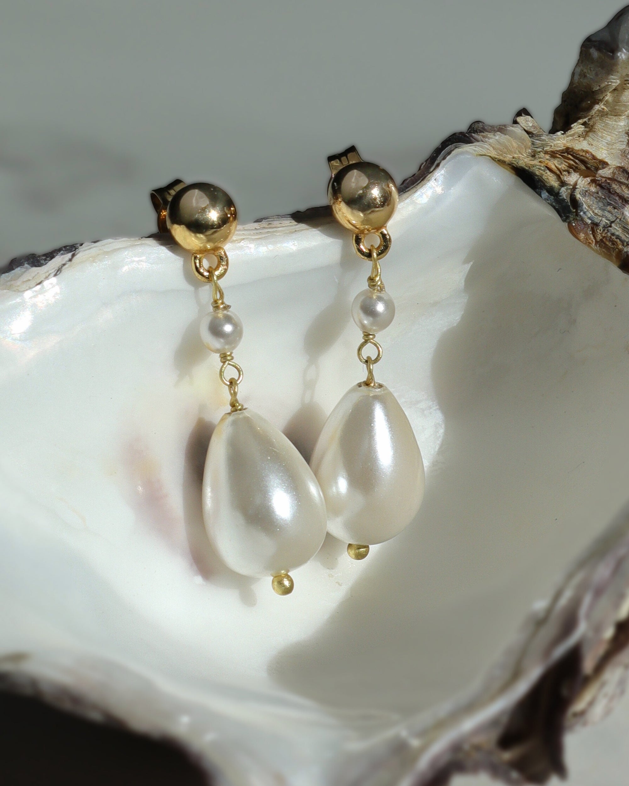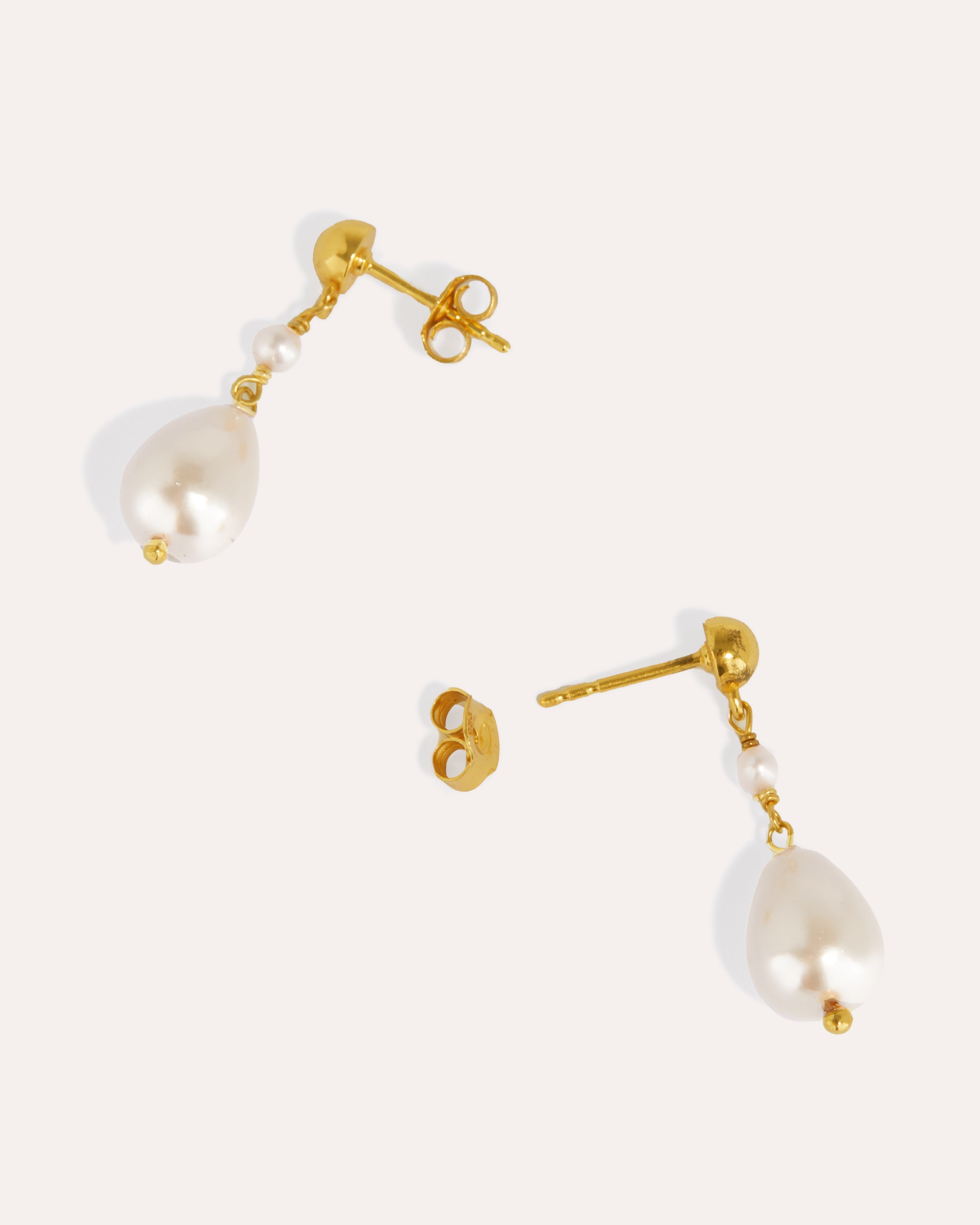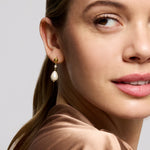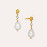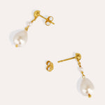 These stunning drop earrings are handcrafted in 18ct gold plated recycled sterling silver and feature a duo of freshwater pearls, perfect for stacking and adding a touch of pearly shine to any outfit.