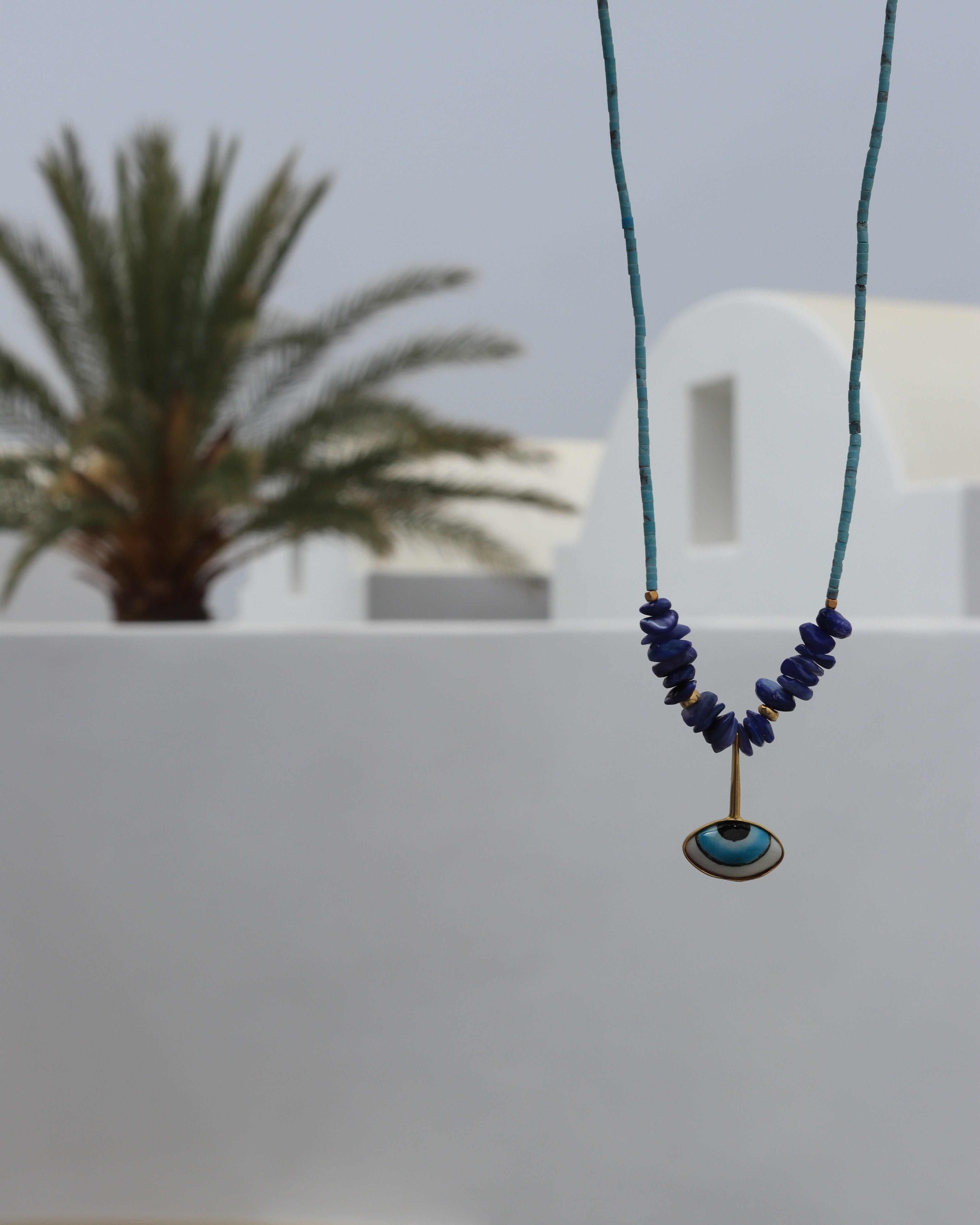 Our bestselling Adira Evil Eye necklace is back with a twist, this time in a beautiful beaded design that is sure to turn heads. Adorned with turquoise-coloured beads, the necklace is elevated with the iconic blue evil eye design in hand-painted porcelain, complimented by organically shaped dyed Mother of Pearl gemstones for a truly unique beaded design.