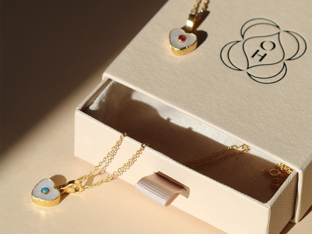 Our mailing boxes and our jewellery boxes are created with FSC-certified paper from 70% recycled sources and our pouches are made from 100% cotton. With no foam or velour inserts, our packaging is not just beautiful to gift and reuse, but also plastic-free, 100% recyclable and biodegradable.