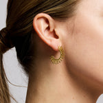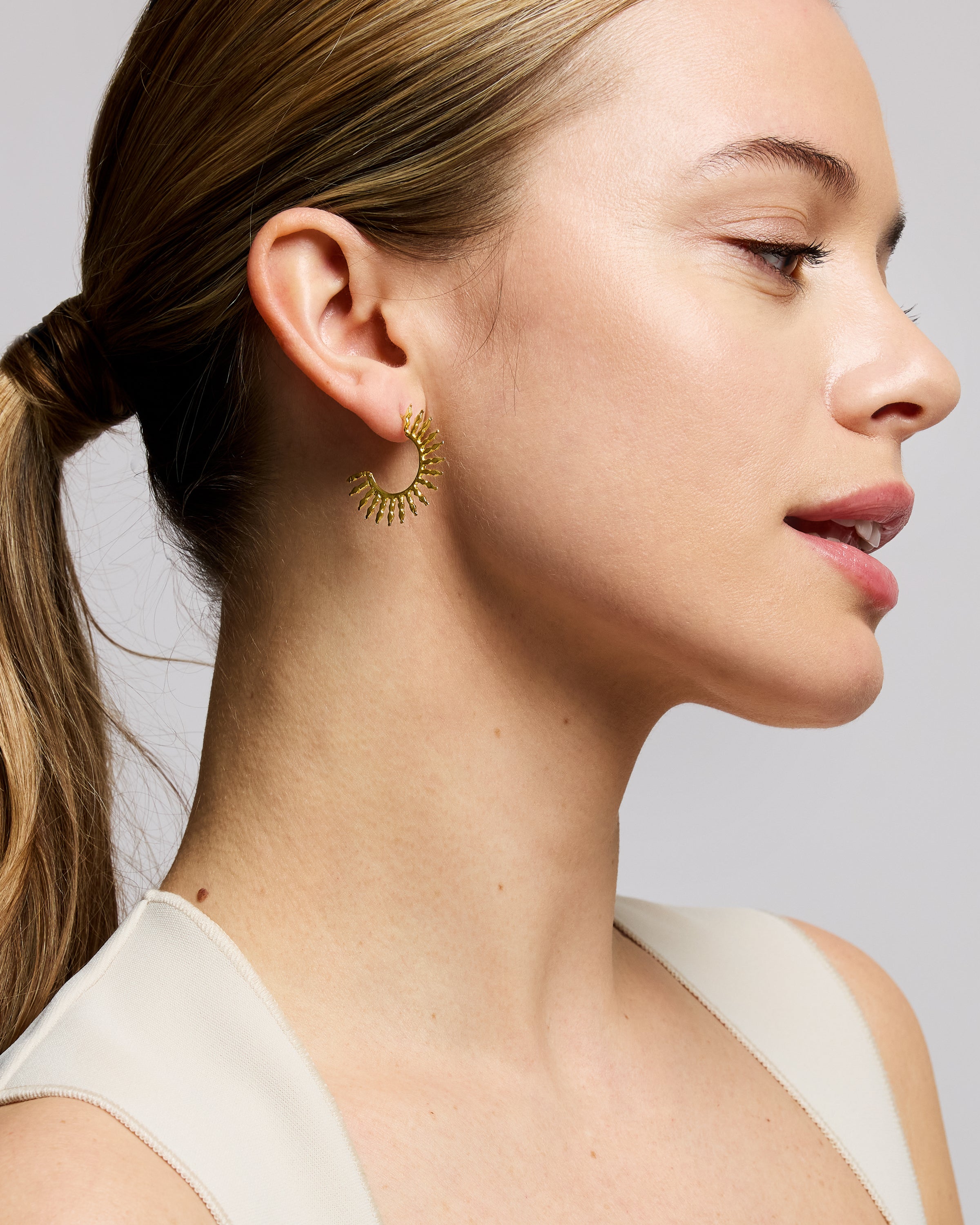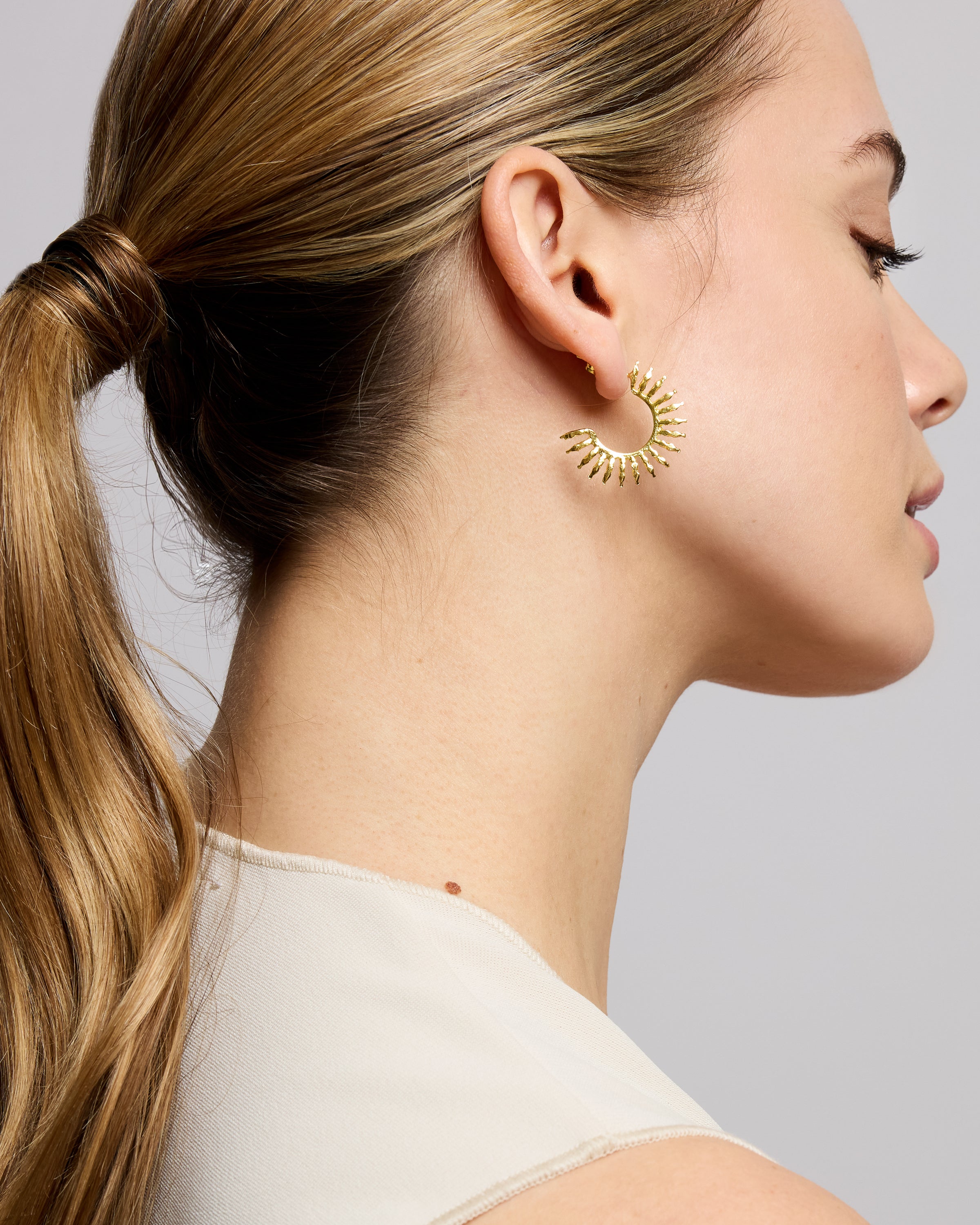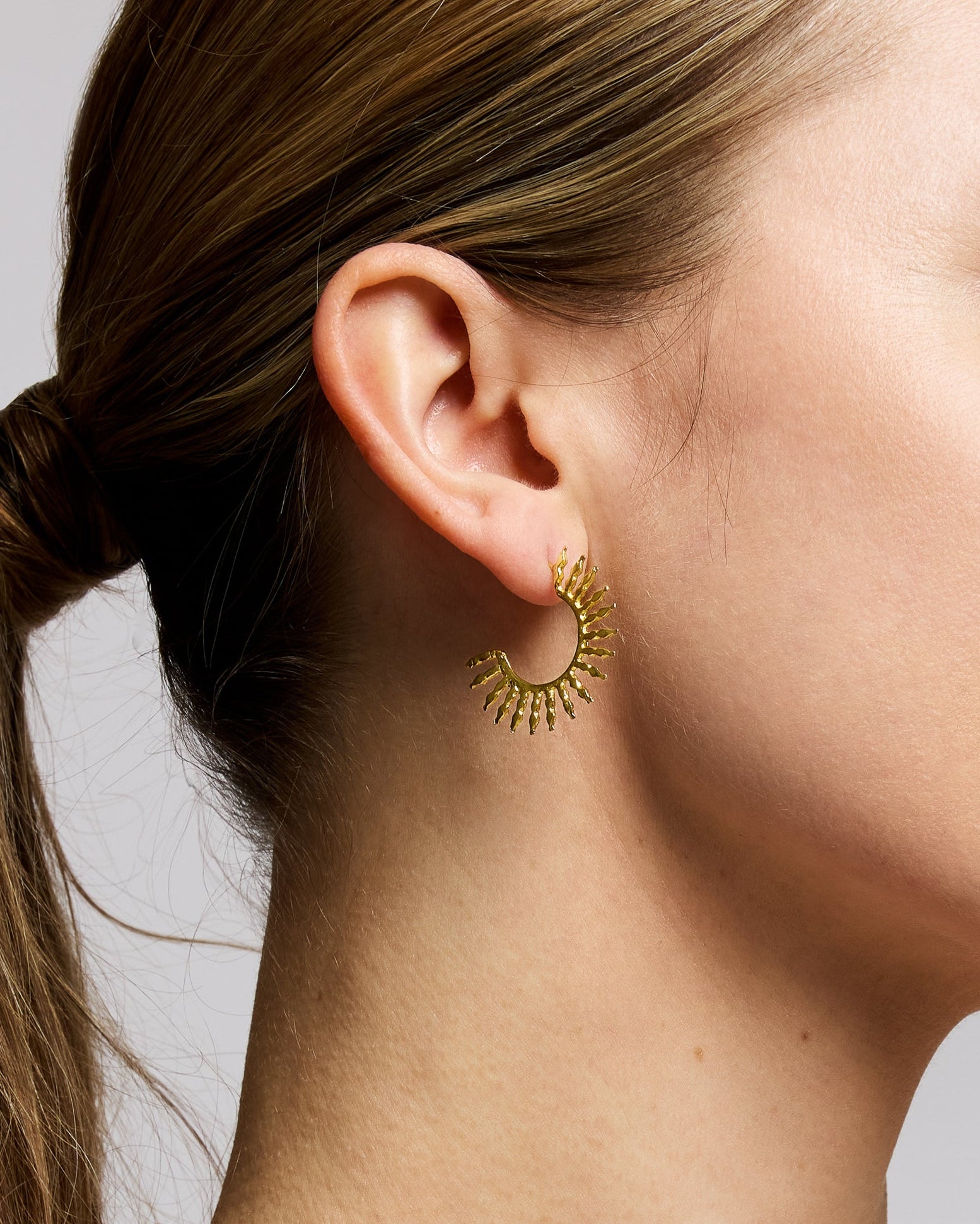 Reminding us of a petite sun, these small gold hoops have an eye-catching design. Handmade from 21ct gold plated brass, these boho earrings have been finished with a chic hand-hammered texture. Wear these sun earrings to brighten up a look. Ear posts are plated on sterling silver and secured with a butterfly clasp.
