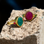 Adjustable for a perfect fit, this cocktail ring is handmade with an oval shaped ruby stone and two petite green cubic zirconia crystals for a touch of extra colour. Easy to wear and style, this gold ring is perfect for adding a gemstone sparkle to your ring stack.