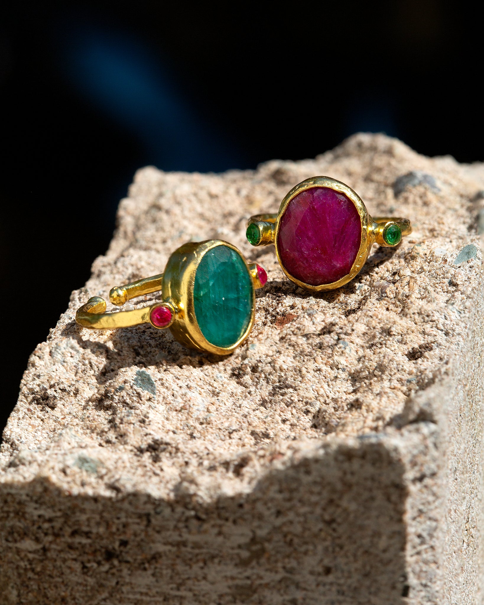 Adjustable for a perfect fit, this cocktail ring is handmade with an oval shaped ruby stone and two petite green cubic zirconia crystals for a touch of extra colour. Easy to wear and style, this gold ring is perfect for adding a gemstone sparkle to your ring stack.