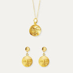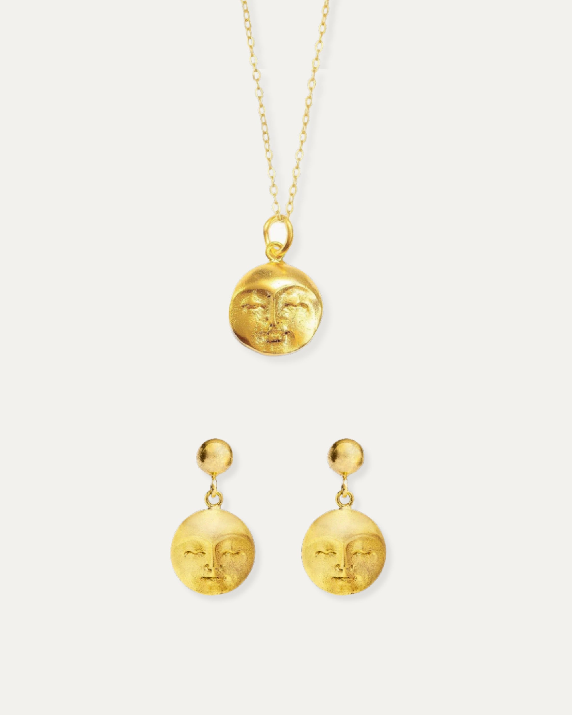 Experience celestial elegance with the Moon Face Set, featuring delicately gold-plated earrings and a matching necklace. Inspired by lunar beauty, each piece catches the light, adding a dreamy touch to any outfit. Perfect for layering or wearing solo, this set blends sophistication with a hint of mystique.
