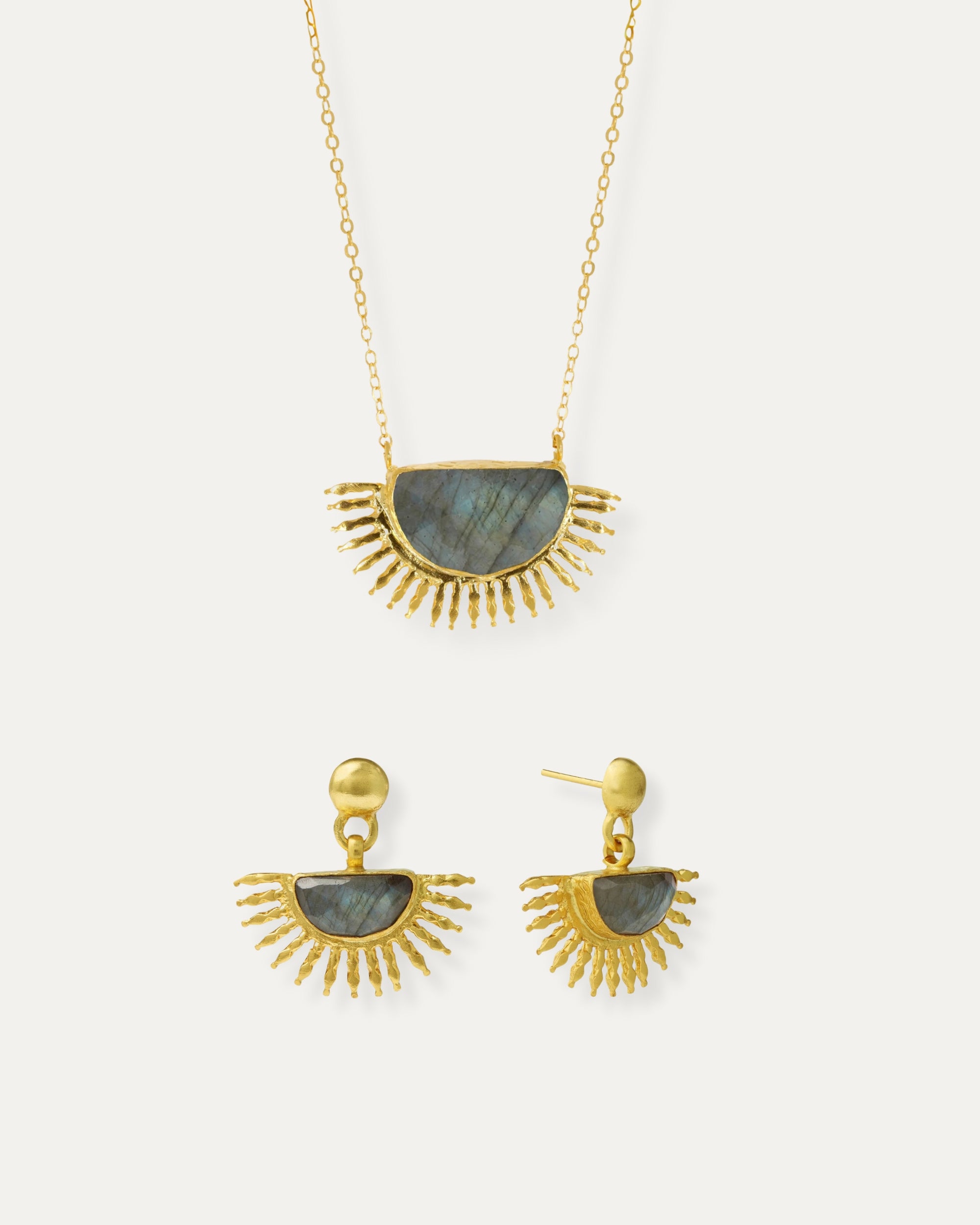 The Sunrise Labradorite Set pairs a radiant necklace with matching earrings, both finished in 21ct gold plating. The striking labradorite gemstones shift with light, echoing the colours of dawn for a look that feels both modern and timeless. Perfect for gifting or adding a touch of luminous elegance to your collection.